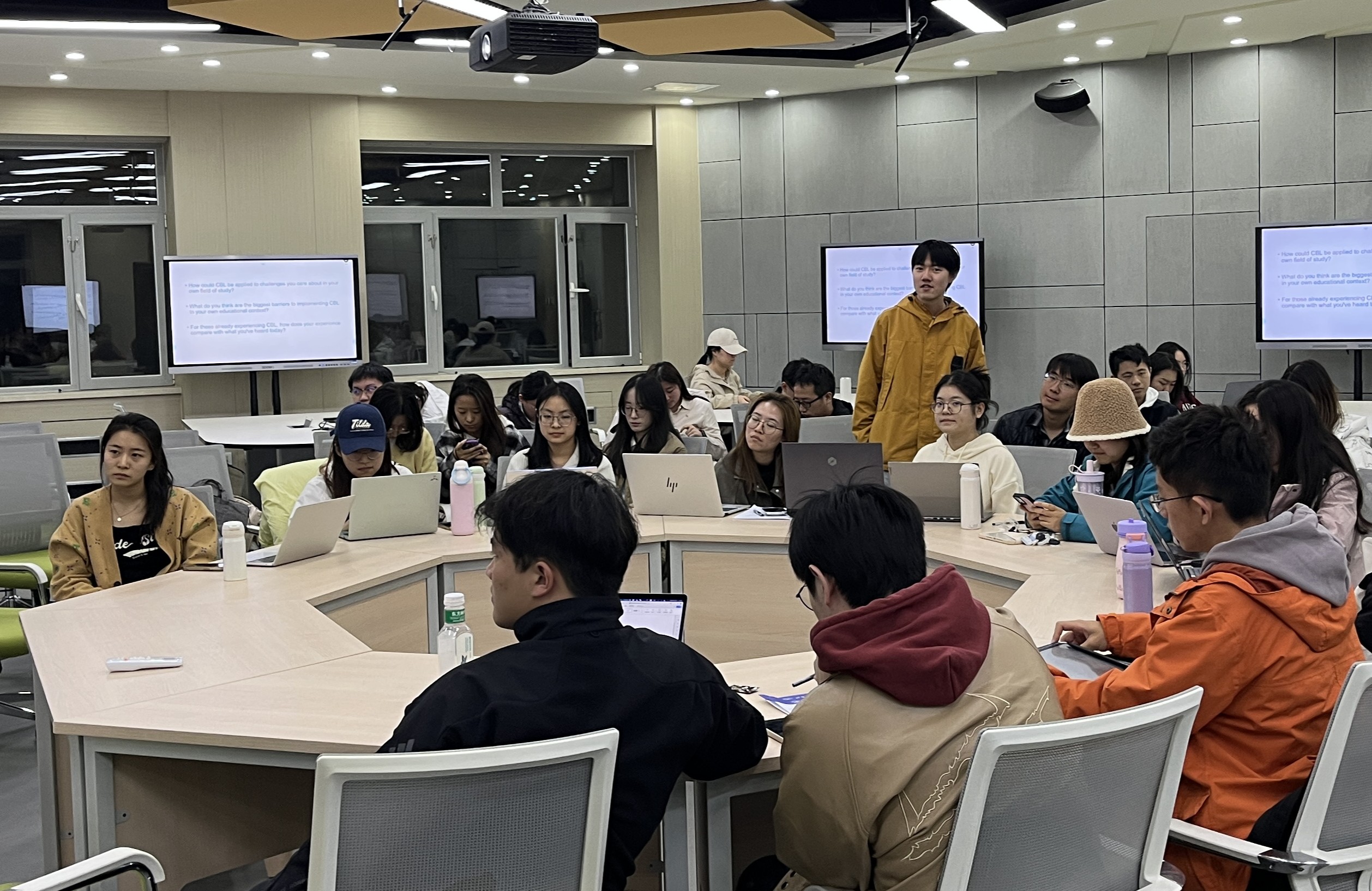 在随后的研讨环节,主持人结合Membrillo教授的分享,引导现场学生开展分组讨论,聚焦三个核心问题深化对CBL的认知:“如何将CBL应用到自身专业领域的挑战中?”“在当前教育环境下,实施CBL的挑战是什么?”“参与过CBL教育的同学,如何看待本次讲座内容与自身经历的差异?"