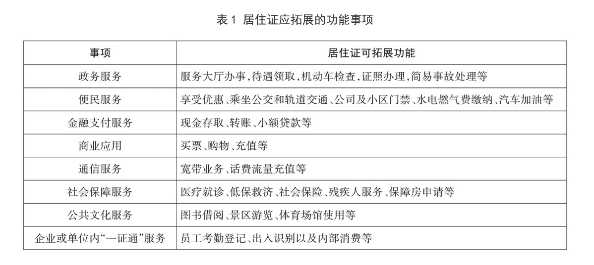 第二,打破部门间信息壁垒,拓展居住证功能,增强居住证通用性。在居住证功能拓展上,应整合资源共享平台,建设统一、规范、与移动采集终端互联的人口信息管理系统,实现教育、住建、公安、交通、社保、卫生计生及民政等部门人口信息互联互通,扩充IC 卡式居住证的机读信息,实现政府服务、公用事业、商业金融等跨行业、跨部门信息共享。逐步拓展居住证服务功能(见表1),使其由“一证一能”变为“一证多能”,成为流动人口名副其实的“一证通”。